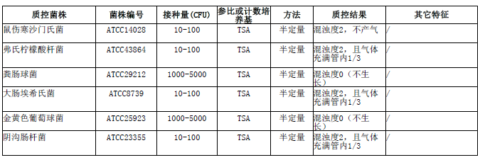 月桂基硫酸鹽胰蛋白胨肉湯(LST)微生物靈敏度試驗:按標簽用法制備培養基,接種以下質控菌株,放置36±1℃需氧培養24-48小時。
